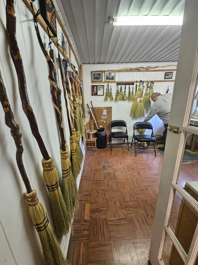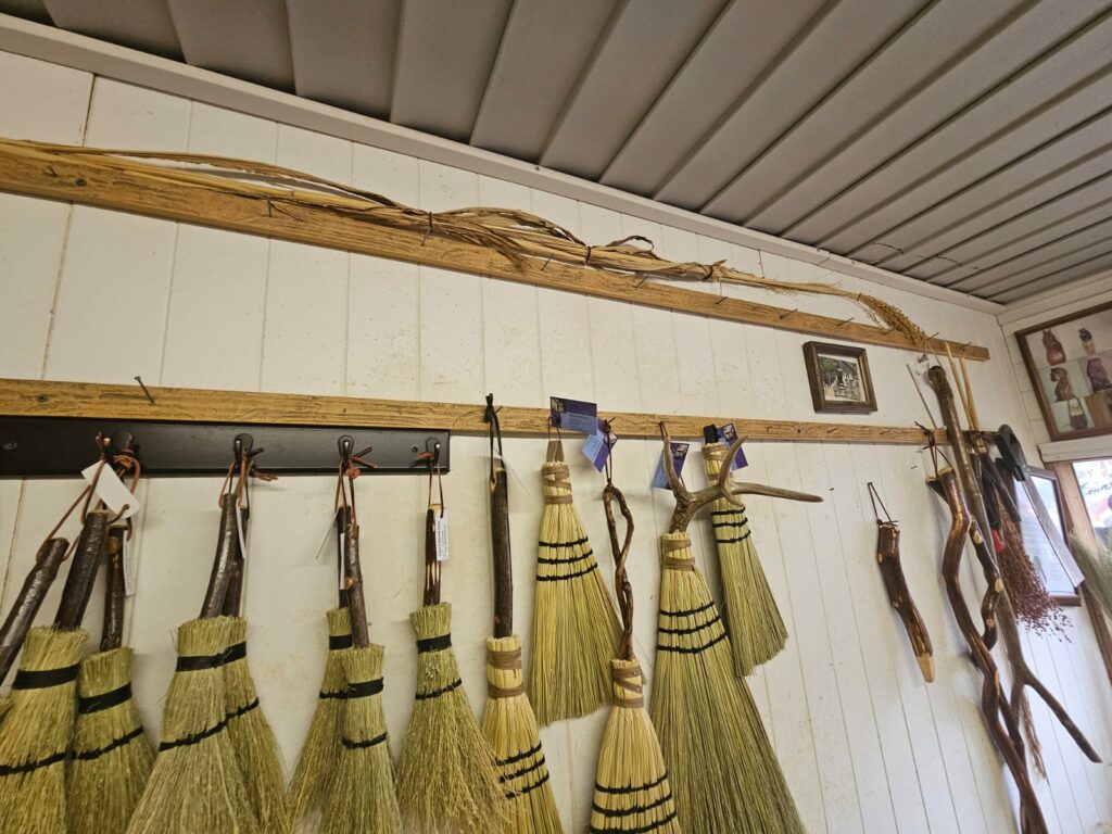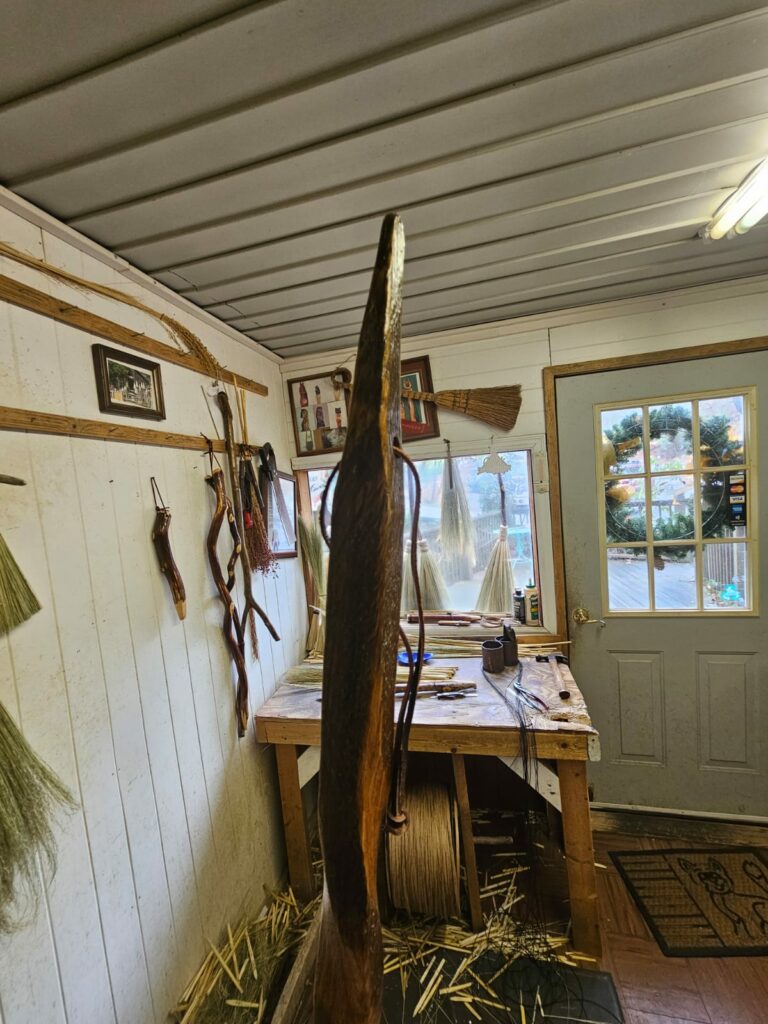 Tucked away in a small back room behind Cliff Dwellers Gallery, I found Ogle’s Broom Shop, a place where time seems to stand still. You could almost miss the door in the back of the art gallery, but I happened to find his external door while walking back from another neighboring building. It is one single room, and not a lot of space to work. The proprietor, David Ogle, sat in a simple wooden chair, his practiced hands weaving twine through authentic broom corn bristles, continuing a family tradition that apparently spans three generations of Appalachian craftsmen.